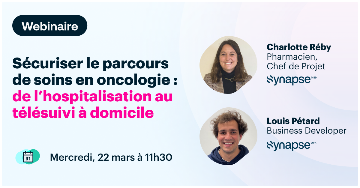 "html_content": "<p><b>✔ Quels sont les principaux challenges rencontrés par les professionnels de santé en oncologie ?</b></p>\n<p><b>✔ Comment Synapse Plateforme permet aux équipes soignantes de sécuriser le suivi des patients en oncologie ? Qu’ils soient en ville, à l’hôpital ou qu’ils accompagnent le patient à son domicile.</b></p>\n<p><b>✔ Par quels moyens Synapse Plateforme intègre-t-elle le télésuivi patient ?</b></p>\n<p>Pour répondre à ces questions, les inscriptions pour le prochain webinaire de Synapse Medicine \"Sécuriser le parcours de soins en oncologie : de l'hospitalisation au télésuivi à domicile\" sont ouvertes.</p>\n<p><a href=\"https://app.livestorm.co/synapse-medicine/securiser-le-parcours-de-soins-en-oncologie?type=detailed\" target=\"_blank\">S’inscrire au webinaire</a></p>\n<p>Ne ratez pas cet évènement du <b>mercredi 22 mars prochain à 11h30,</b> animé par <a href=\"https://www.linkedin.com/in/charlotte-reby-2b6a71138/?originalSubdomain=fr\" target=\"_blank\">Charlotte Réby</a> - Pharmacien, Chef de Projet chez Synapse Medicine, et <a href=\"https://www.linkedin.com/in/louis-p%C3%A9tard-bb1bb3a8/\" target=\"_blank\">Louis Pétard</a> - Business Developer chez Synapse Medicine.</p>\n<p>Depuis plusieurs années, Synapse Medicine est impliquée dans l’amélioration des parcours de soins, de l’hôpital à la ville, sur les activités de prescription, de délivrance et de télésurveillance.</p>\n<p>La société, fondée par des professionnels de santé, facilite notamment le suivi des patients à domicile dans le cadre de traitements anticancéreux oraux, grâce à sa solution Synapse Plateforme. Celle-ci est :</p>\n<p>✔interopérable avec les DPI des établissements de santé</p>\n<p>✔ utilisée par plusieurs dizaines d’établissements de santé, dont l’Institut Gustave Roussy</p>\n<p>✔ directement connectée à son application grand public Goodmed pour le télésuivi patient.</p>\n<p>La télésurveillance médicale est un sujet fort d’actualité, notamment par son passage dans le droit commun suite à la publication d’un décret au Journal officiel le 30 décembre 2022 dernier.</p>\n<p><em>Vous n'avez pas la possibilité de participer ? </em><b><em>Pas de problème !</em></b><em> <a href=\"https://app.livestorm.co/synapse-medicine/securiser-le-parcours-de-soins-en-oncologie?type=detailed\" target=\"_blank\">Inscrivez vous quand même</a> , et recevez l'enregistrement à la suite du webinaire.</em></p>",